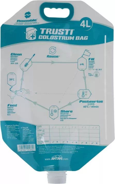 Praktikus, többször használható megoldás újszülött borjak biztonságos és hatékony kolosztrum-ellátásához. Alkalmas kolosztrum tárolására, fagyasztására, majd későbbi felmelegítés utáni etetésre.