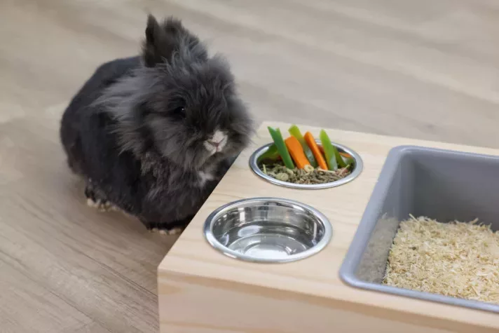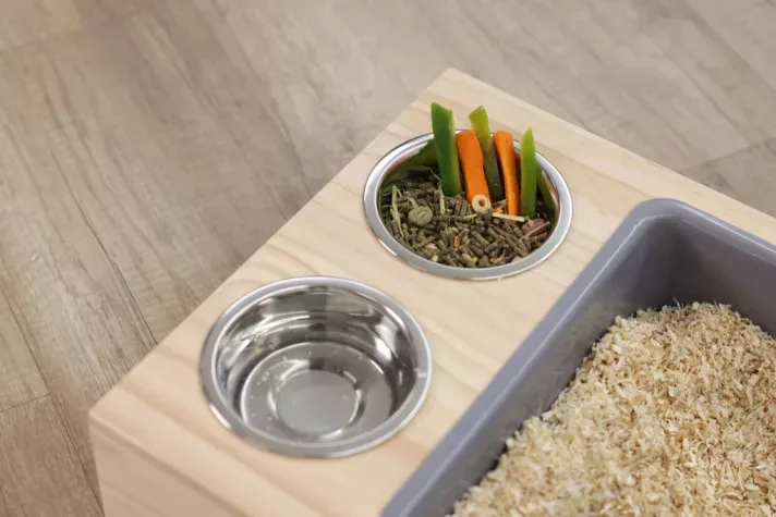 • etetőállomás könnyen tölthető szénatartóval és két rozsdamentes tállal a víz és száraztáp vagy zöldségek kínáláshoz