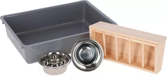• 43 x 31.5 x 9.5 cm méretű tálcával alomnak, amely ásódobozként vagy toalettként használható
