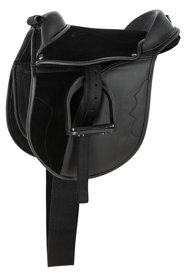 Economy póni nyeregszett 110 cm hevederrel: Komplett, fekete színű póni nyeregszett szintetikus anyagból, csúszásgátló ülőfelülettel és levehető térdtámaszokkal. Ideális kezdő lovasok számára.