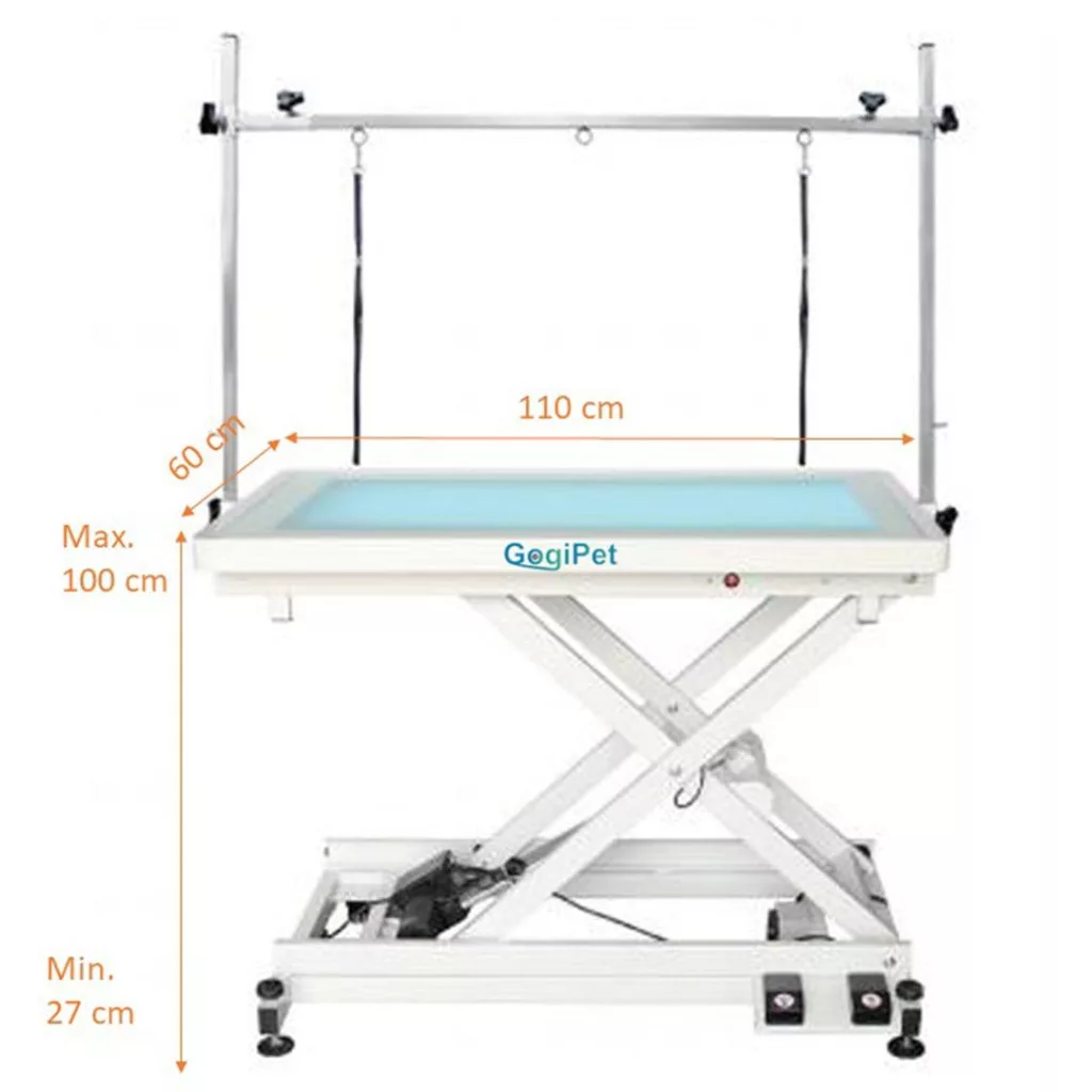 A GogiPet Diamond elektromos, LED háttérvilágításos kozmetikai asztal prémium megoldás szalonok számára, 110 × 60 cm-es edzett üveg munkafelülettel és 27–100 cm között állítható magassággal. X-emelő rendszerének köszönhetően rendkívül stabil, alacsony belépési magassága pedig kényelmes a kisebb vagy idősebb kutyáknak is. Teljes felszereltségével (rögzítőkeret, hurkok, beépített csatlakozó, kerekek) professzionális, biztonságos munkavégzést biztosít akár 100 kg-ig.