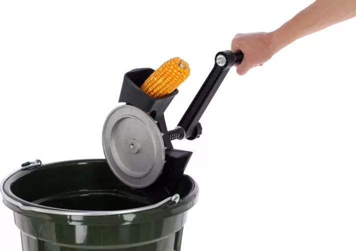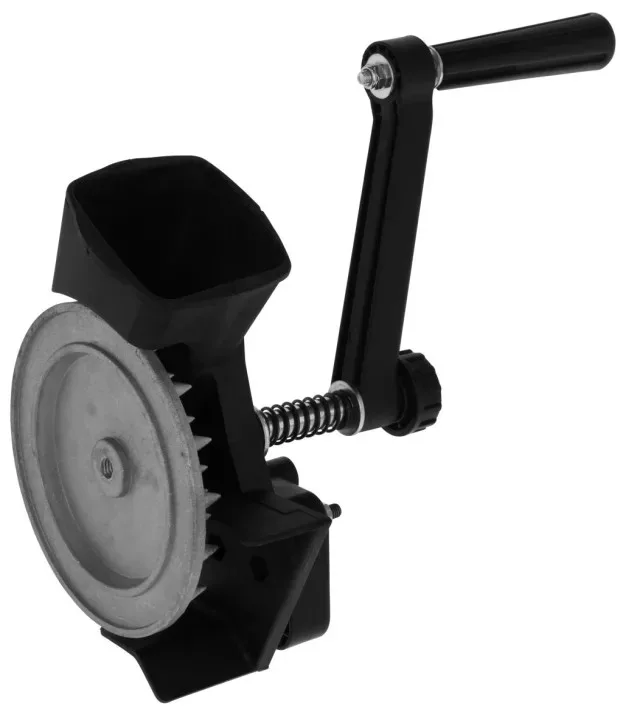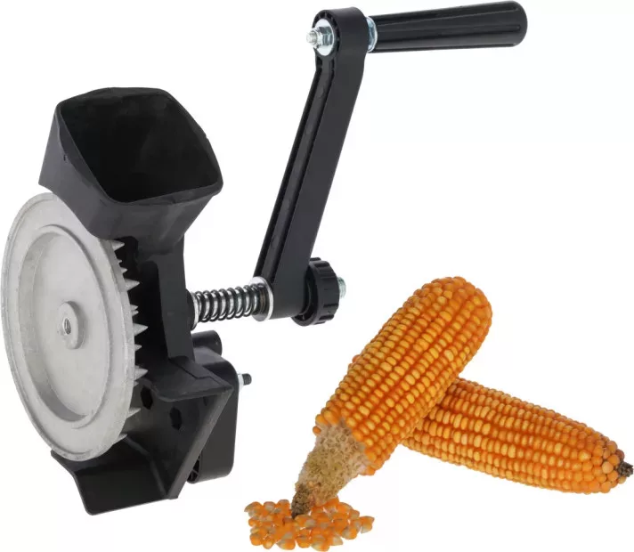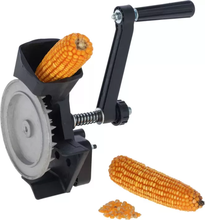 Hobbi állattartáshoz használható kézi kukorica tisztító, erős alumínium forgótárcsával, állítható nyomással, stabil fogóval, felaksztható vázzal és extra stabil kialakítással.