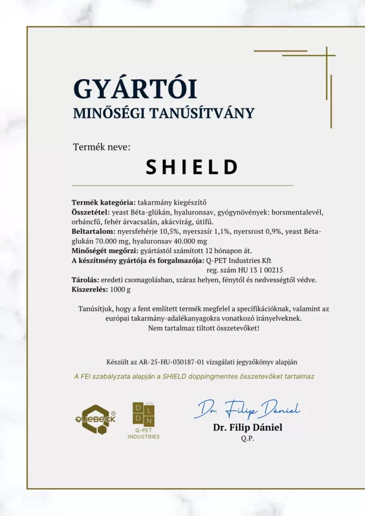 A SHIELD komplex gyomorvédő kiegészítő, amelyet a lovaknál egyre gyakoribb gyomorfekély (EGUS) kockázatának csökkentésére fejlesztettek ki. Hialuronsavval, béta-glükánnal, speciális gyógynövényekkel és pufferanyagokkal támogatja a gyomornyálkahártya védelmét, segíti a gyulladásos folyamatok mérséklését és hozzájárul a kiegyensúlyozott emésztéshez.