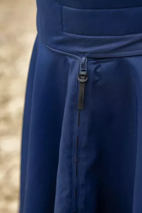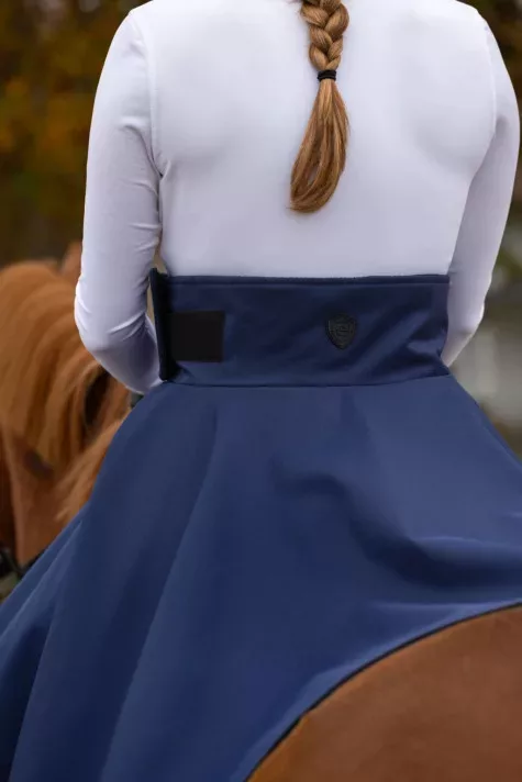 Klasszikus lovaglószoknya praktikus cipzárral, amely megkönnyíti a szoknya fel- és levételét. A lábrögzítő pántok biztosítják, hogy a szoknya folyamatosan a helyén maradjon. A meleg gyapjú bélés és a vízálló, szellőző külső anyag közötti tökéletes harmónia garantálja a maximális kényelmet. Kiváló választás és egy kötelező darab a lovasoknak!